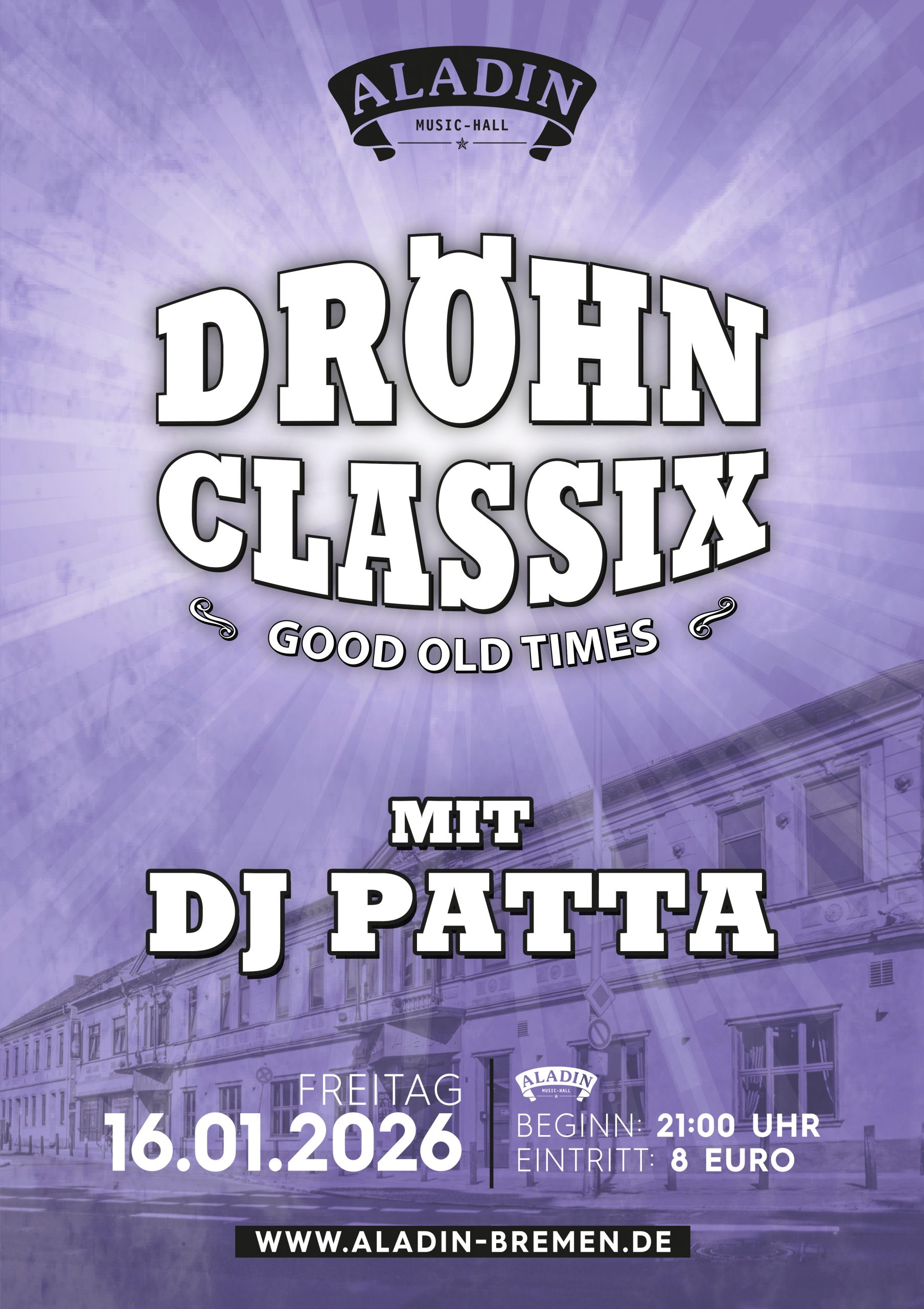 An diesem Abend kehren die Aladin-Klassiker der „GUTEN ALTEN ZEIT“ zurück! Gespielt werden die besten Songs der letzten Jahrzehnte von Dj Patta!