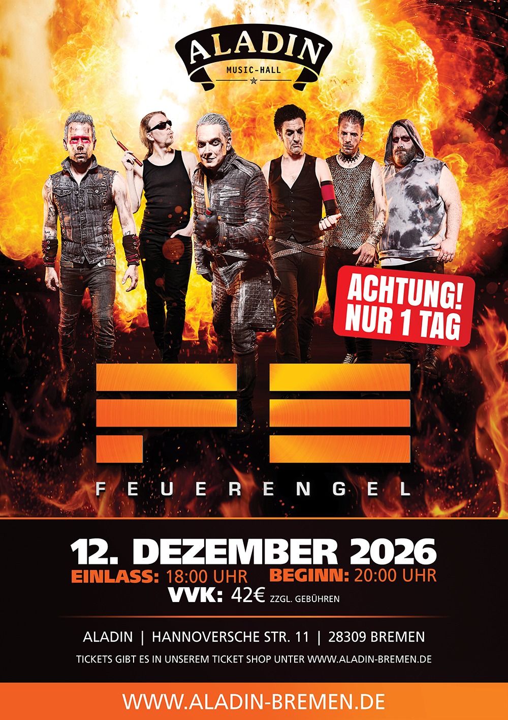1999 waren FEUERENGEL erstmals im Tivoli zu Gast, nach drei weiteren Shows folgte 2008 der Wechsel ins Aladin. Seitdem spielt die Band jedes Jahr dort. „Die Show im Aladin ist jedes Jahr ein Highlight und aus unserem Tourplan nicht mehr wegzudenken“, sagt FEUERENGEL-Sänger Boris Delic. „Wir freuen uns jedes Jahr darauf!“